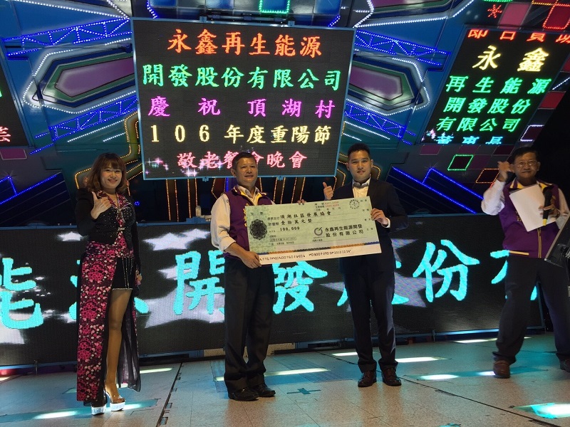 敬老重陽節前夕,永鑫能源於嘉義縣布袋鎮建德宮舉辦重陽晚會暨漁電共生說明會,透過晚會與地方鄉親交流情誼。晚會原先計畫以「辦桌」形式舉辦,考量疫情仍未解除,永鑫能源與建德宮廟方討論,和當地夜市攤販合作,發給居民夜市卷於夜市兌換商品,不僅做好防疫更能振興當地經濟。